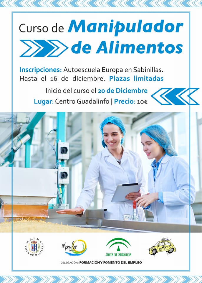 Formación y Fomento de Empleo recuerda a todos los vecinos que hasta el próximo viernes día 16 de diciembre tienen de plazo para formalizar su inscripción en el Curso de Manipulador de alimentos.