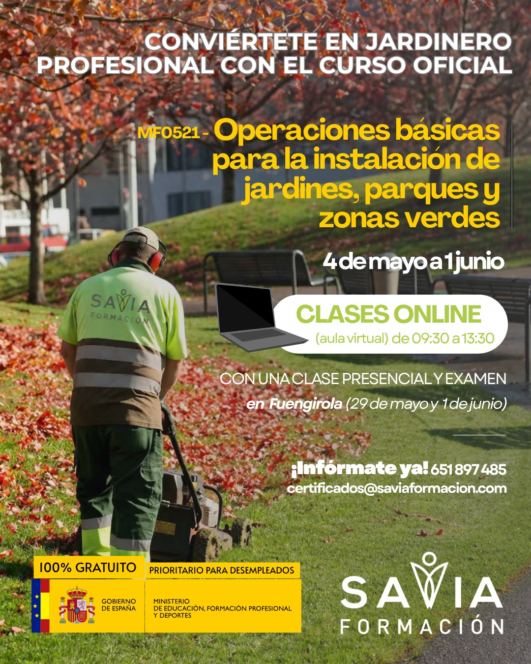 Se trata del curso “Operaciones básicas para la instalación de jardines, parques y zonas verdes” (MF0521), una formación oficial que permitirá a los participantes adquirir conocimientos fundamentales en el mantenimiento y creación de espacios verdes, un sector con alta demanda laboral.