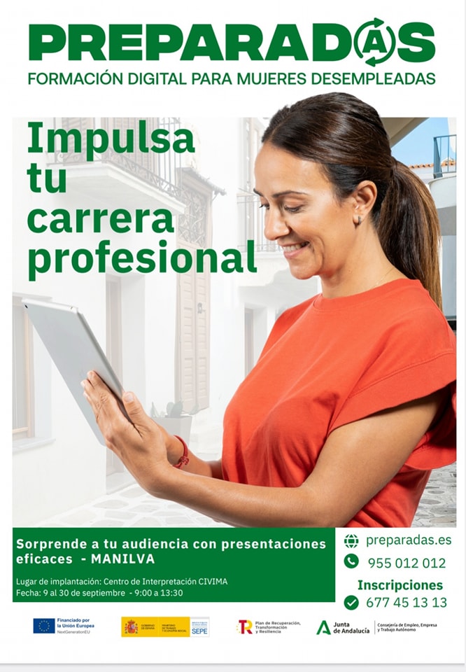 El curso, titulado «Sorprende a tu audiencia con presentaciones eficaces», se llevará a cabo del 9 al 30 de septiembre en horario de mañana, de 9:00 a 13:00 horas, en las instalaciones del Centro de Interpretación Las Viñas de Manilva (CIVIMA). A través de esta formación, las mujeres podrán adquirir las habilidades necesarias para crear presentaciones impactantes y comunicar sus ideas de forma efectiva.